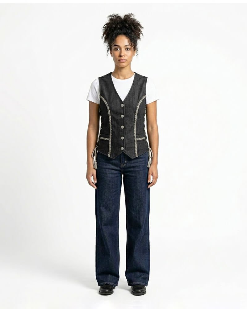 - Ronin Denim Vest Top for Women is crafted from premium black denim, this vest offers a sleek, edgy look that pairs seamlessly with any outfit.